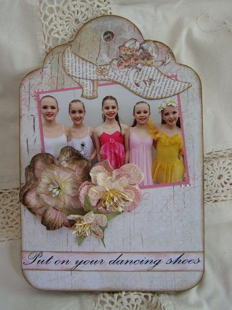 The pattered papers on the 4th tag page is from The Forgotten Meadows page. Miss Meghan is second from the left this time in a beautiful modern ballet dress. The flowers I chose I feel go so well with her dress. The large flower is from the Velvet Flower range, Delphinium Posy - Antique Pink and the smaller is Carabella Rose Posy - Fairy Pink. The shoe and title are fussy cut from the Put On Your Dancing Shoes paper.